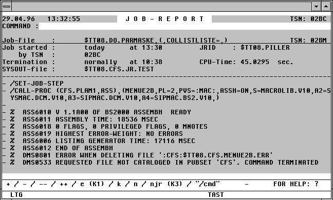 | Beim Starten einer DO-Prozedur im Enter und JRF=SYSLST wird in der Enter-Datei neben dem Kommando /SYSFILE SYSLST auch /OPTION MSG=FH eingefügt. Damit wird erreicht, daß auch die SYSOUT-Ausgaben in der SYSLST-Datei enthalten sind. | |