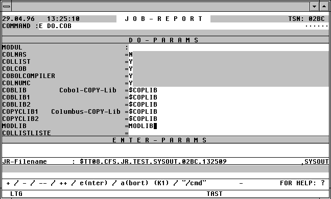 | 5) | Wenn in einer Connection ein /DO-Kommando abgesetzt wird, so übernimmt JRS automatisch die DO-Parameter Analyse. Bei unbesetzten Parametern wird die Parameter-Maske ausgegeben. Der Benutzer erhält dabei eine formatierte Liste aller Parameter der Prozedur und kann (muß aber nicht) noch fehlende Parameterwerte ergänzen. Falls die Connection in einer anderen Benutzerkennung oder auf einem anderen Host-Rechner eröffnet wurde, so kann diese Funktion nicht genutzt werden. |