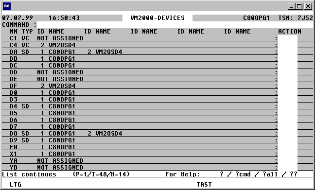 | Das Kommando VMPDT zeigt in einer Maske alle generierten Geräte und deren aktuelle Zuweisung zu einer virtuellen Maschine oder einem Monitorsystem an. Mit Hilfe von Action-Codes können die Geräte und Drucker zwischen verschiedenen Systemen umgeschaltet werden .