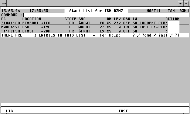 | Im Kommandofeld der Stack-Maske sind alle Eingaben erlaubt, die auch in der Task-Liste möglich sind. Zusätzlich kann das Kommando M (Modify) angegeben werden. Damit können die Registerinhalte des angezeigten Stacks modifiziert werden. | |