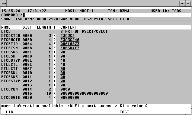 | Der Action-Code D bei einem Modul verzweigt in die Display-Maske und zeigt den Inhalt des Moduls an. Um Speicherbereiche anzuzeigen, die nicht von einem Modul belegt sind (z.B. REQM-Bereiche), kann das Kommando DISP verwendet werden. | |