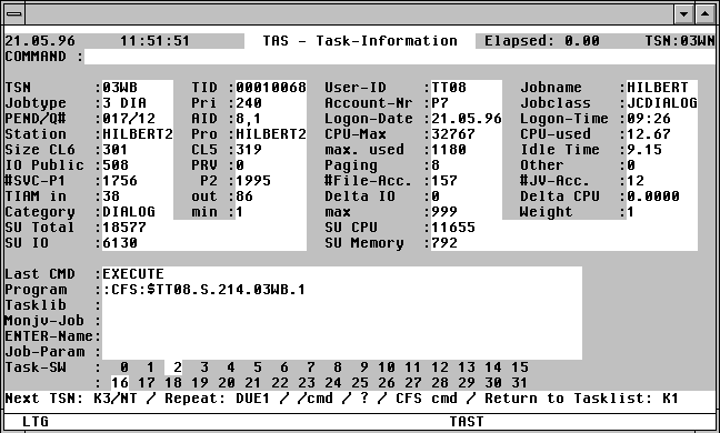 | ATL [INT=n] | Automatic Task List. Mit diesem Kommando wird ein periodischer Update der Maske alle n Sekunden erreicht (Standard = 30 Sek.) | |