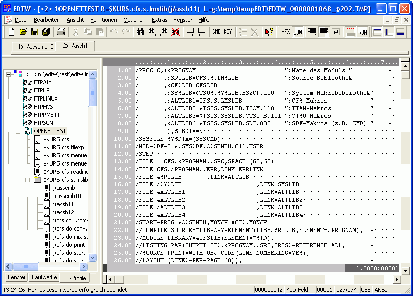 Datenfenster und Baumfenster mit Liste der Filetransfer-Profile