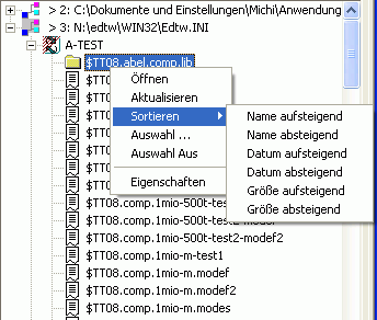 | Falls es sich um ein Verzeichnis oder ein Profil im Baumfenster BUTTDIALLEFThandelt, wird ein Menü mit den Optionen zum Öffnen, Aktualisieren, Dateiauswahl, Sortieren und Anzeigen bzw. Ändern der Eigenschaften angezeigt: | |