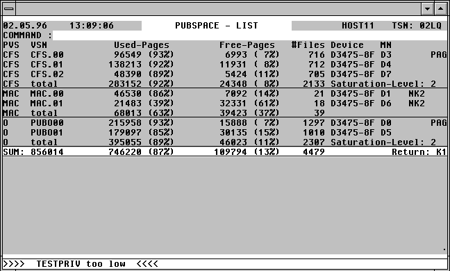SAT Only the summary line (see below) will be displayed for each Public Volume Set. A column titled PagesNextSat will be displayed instead of the #Files column. The values in this column reflect, for each pubset, the number of pages free till the next saturation level is reached.
