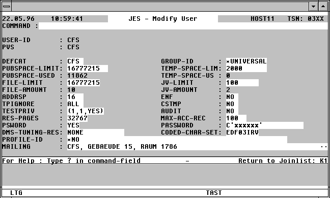 | In den Feldern USER-ID/PVS ist die neu anzulegende Benutzerkennung und die gewünschte PVS-ID einzutragen. Die Felder DEFCAT bis MAILING können, falls gewünscht, im gleichen Eingabeschritt geändert werden. In den Feldern ACCOUNT bis CLASS wird die erste Abrechnungsnummer des zu kopierenden Joineintrags angezeigt. Auch diese können unverändert übernommen oder für den neuen Joineintrag modifiziert werden. Die Action AU übernimmt nur die erste Abrechnungsnummer des markierten Joineintrags. | |