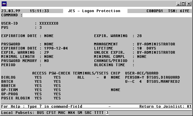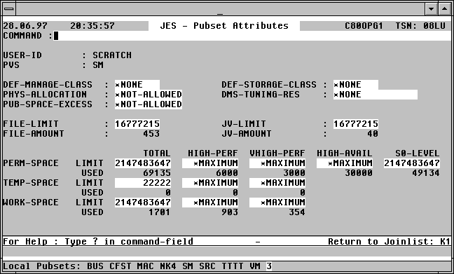 | DUPA | Die auf eine User-Id bezogenen Attribute eines System Managed (SM) Pubsets werden werden in einer Maske mit folgendem Format angezeigt: |