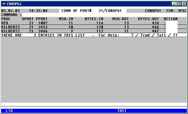 | Das Kommando PORT bietet in einer Maske eine Übersicht aller offenen TCP/IP Socket-Ports. Mit Hilfe von Action-Codes können die mit den Ports konnektierten logischen Partner, sowie die Tasks (TSN's) im eigenen Host, die mit den Ports arbeiten angezeigt werden. Über Action-Codes ist es darüber hinaus möglich, einzelne Ports zu schließen oder die Ausgabe eines BCSHOW-Kommando für die Sockets am Bildschirm anzuzeigen. | |
