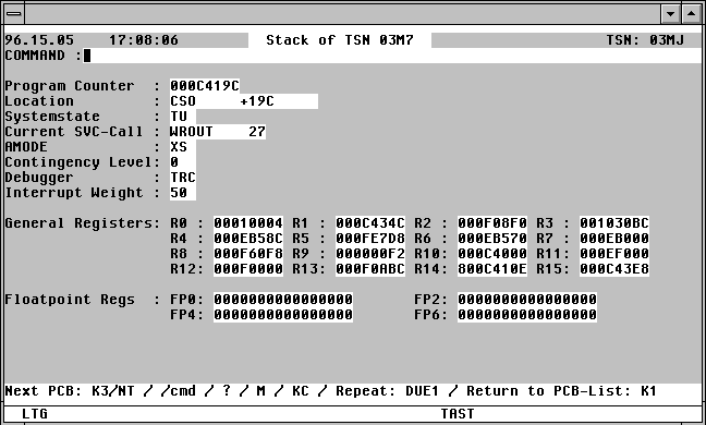 | Im Kommandofeld der Stack-Maske sind alle Eingaben erlaubt, die auch in der Task-Liste möglich sind. Zusätzlich kann das Kommando M (Modify) angegeben werden. Damit können die Registerinhalte des angezeigten Stacks modifiziert werden. | |