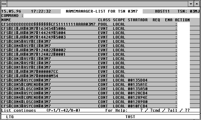 | Zur Anzeige einer systemglobalen Liste aller im System benutzten Namen kann das Kommando NAME verwendet werden. Zur systemglobalen Anzeige aller BCAM-/DCAM-/EVNT-/POOL-/SERI-/UTM-Namen stehen die gleichnamigen Kommandos zur Verfügung. | |