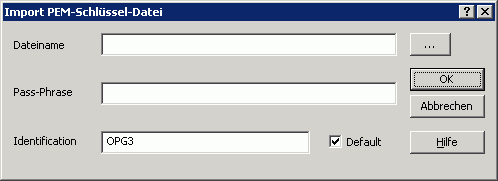 | Über die Import-Funktion kann ein Schlüsselpaar aus einer bereits vorhandenen, extern erzeugten PEM-Schlüsseldatei (z.B. mit OpenSSL command) importiert werden. Damit ist die Verwendung eines gemeinsamen Schlüsselpaares durch unterschiedliche Programme (z.B. openFT, LOG-FT und EDTW) möglich. | |