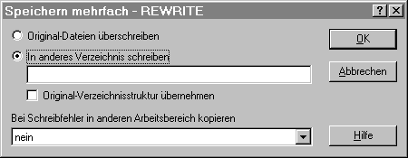 Wurden in einen Arbeitsbereich mehrere Dateien mit dem Kommando READ rng (n) bzw. über das Menü-Kommando Öffnen mehrfach (siehe auch Kommando FSTAT bzw. READ'..*..' und REWRITE) eingelesen, werden alle Dateien zurückgeschrieben. Nach Ausführung des Kommandos wird ein Protokoll ausgegeben, das für jede Datei den vollständigen alten und evtl. neuen Dateinamen und die Anzahl der Sätze enthält.