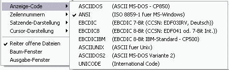 | Falls im Arbeitsbereich vom Standard-Code abweichende Daten stehen, kann hier der entsprechende Editier-Code ausgewählt werden. Dies bewirkt, dass die Darstellung der abdruckbaren Zeichen umgestellt wird und dass alle Datenänderungen im ausgewählten Code durchgeführt werden. Im Hexa-Modus (Kommando HEX ON) wird z.B. im EBCDIC-Code das Zeichen "A" mit "C1" wie im BS2000 dargestellt. Die aktuelle Code-Einstellung wird in der Statuszeile angezeigt. | |
