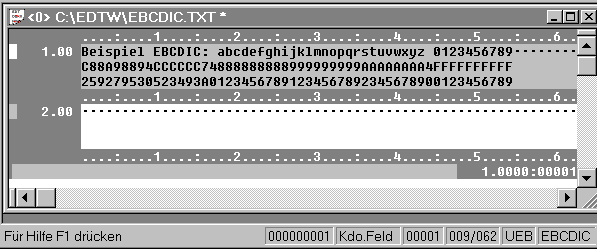 | Im Arbeitsbereich 0 befindet sich eine EBCDIC-Datei. Es ist die Codierung EBCDIC eingeschaltet. Die Characterzeile ist wie im BS2000 lesbar. Zeichen, die über die Tastatur eingegeben werden oder Daten, die durch Kommandos geändert werden, werden in EBCDIC erstellt. | |