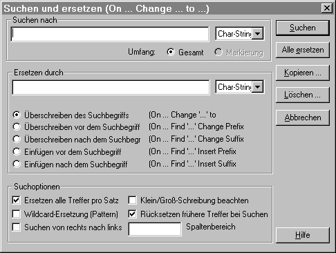 Dies entspricht der Funktionalität der Kommandos ON...CHANGE ...und ON...INSERT .... über die Button Kopieren.. und Löschen... können auch die Funktionen der Kommandos ON...FIND ... COPY..., ON ... DELETE und ON...FIND DELETE ... erreicht werden. Die Suche erfolgt in dem markierten Bereich bzw. wenn nichts markiert ist, im gesamten Arbeitsbereich.