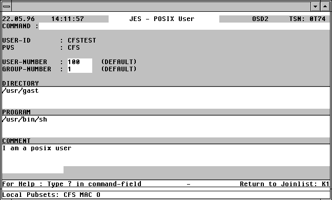| MPU[A] | Für den markierten Joineintrag wird das BS2000-Kommando MODIFY-POSIX-USER-ATTRIBUTES mit den aktuellen Werten versorgt und anschließend in den SDF-Dialog verzweigt. Über diese Variante hat der Benutzer alle Möglichkeiten der Modifikation über einen geführten SDF-Dialog. |