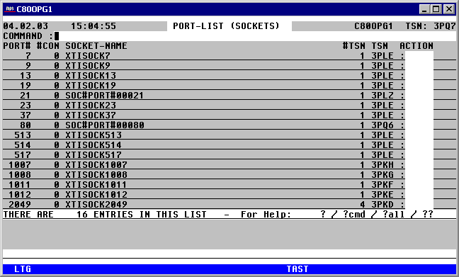 | Das Kommando PORT bietet in einer Maske eine Übersicht aller offenen TCP/IP Socket-Ports. Mit Hilfe von Action-Codes können die mit den Ports konnektierten logischen Partner, sowie die Tasks (TSN's) im eigenen Host, die mit den Ports arbeiten angezeigt werden. Über Action-Codes ist es darüber hinaus möglich, einzelne Ports zu schließen oder die Ausgabe eines BCSHOW-Kommando für die Sockets am Bildschirm anzuzeigen. | |
