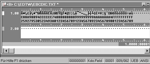 | Im Arbeitsbereich 0 befindet sich eine EBCDIC-Datei. Es ist die Codierung EBCDIC eingeschaltet. Die Characterzeile ist wie im BS2000 lesbar. Zeichen, die über die Tastatur eingegeben werden oder Daten, die durch Kommandos geändert werden, werden in EBCDIC erstellt. | |