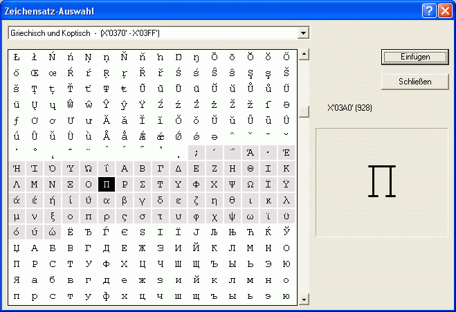 | Beim Klick auf den Button "Einfügen" wird das ausgewählte Sonderzeichen an der aktuellen Cursorposition im Datenfenster oder in der Kommandozeile eingefügt und der Cursor um ein Zeichen weiter positioniert. | |